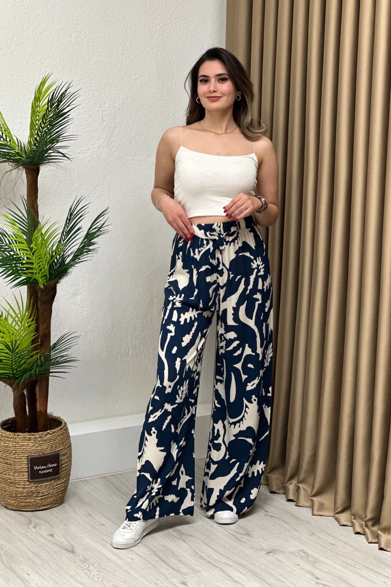 Desenli Viskon Kumaş Beli Lastikli Pantolon İndigo Mavi